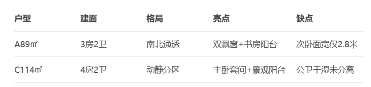 项目主打89-114㎡三至四房,定位刚改,得房率约78%-82%。对比竞品,优势在于“低总价控面积”,但容积率2.8略高,楼间距需关注。