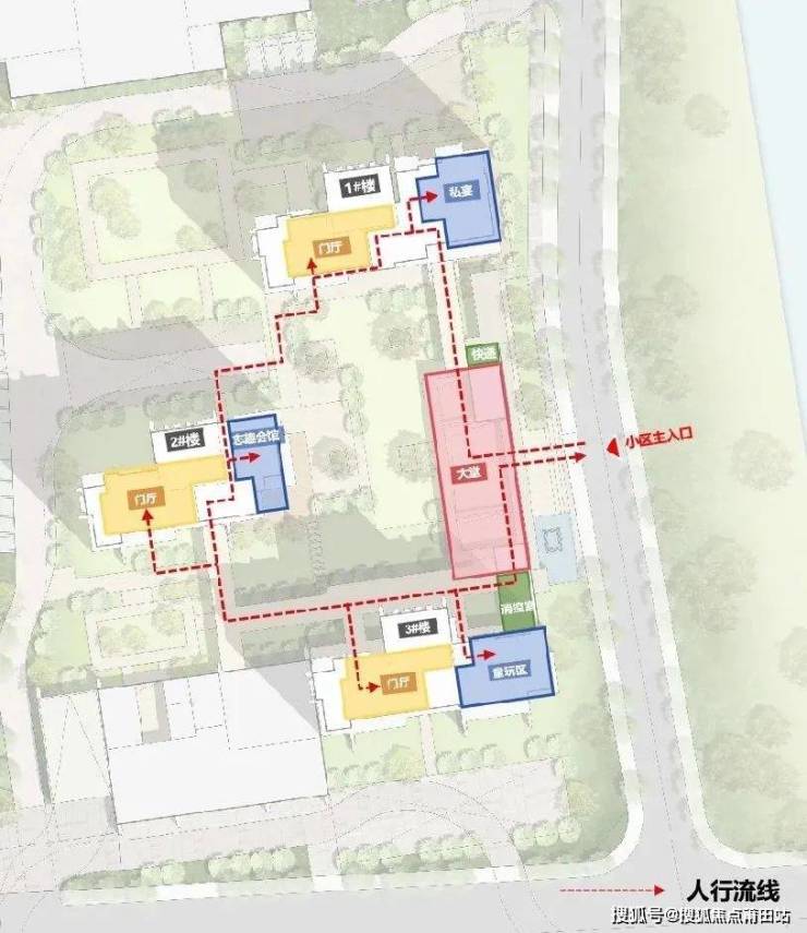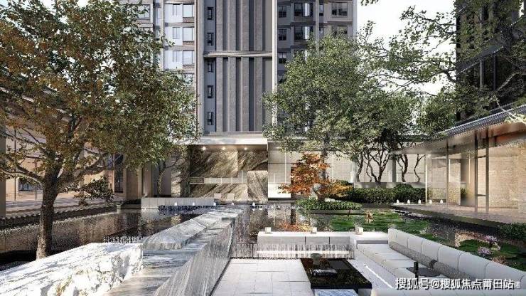 社区入口沿东侧规划道路设置超60米的社区大门搭配景墙式围墙形成一处超100米的宽幅形象界面,水幕光盒+景观叠水的设置与东侧的晋安河水相呼应,为业主营造浪漫的归家体验;
