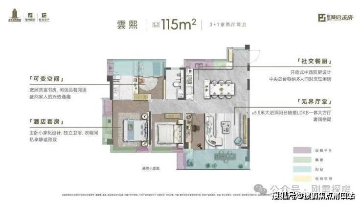 115平:3+1房,在大面宽布局下,没有刻意去做四房,保留了约5.5米宽的大横厅,规避了市场同类型产品的南北不通透,让客餐厅做到了很好的采光对流。