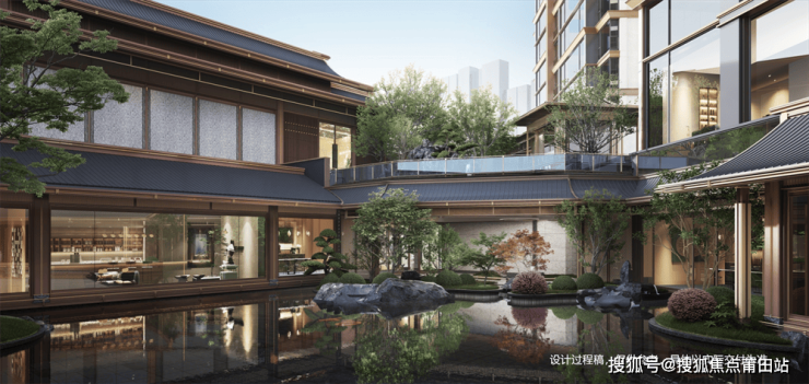 北向俯瞰宋韵园林,社区以宋代美学打造「三进院」景观,139㎡户型北向卧室与阳台可直视中央水景与古树名木,四季皆有「曲水流觞」的东方意境;