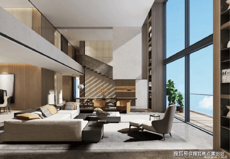 约6米挑高客厅,大气彰显格调,连接观景阳台,让阳光肆意倾洒,朋友相聚、家庭活动皆有充足空间。