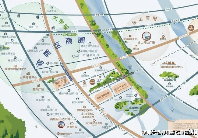 【学府人文带】:百米内可至高新区第二小学(在建),大学城雄踞一侧,周边闽师专附属实验小学、高岐中学(在建)等学府环绕,人文厚蕴润泽一方。