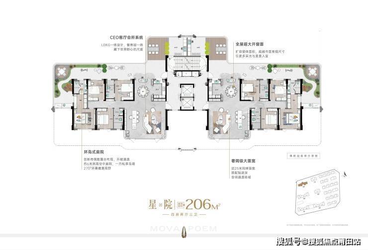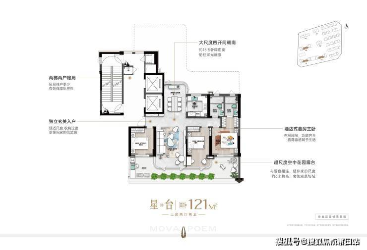 在产品打造上,以第四代立体生态住宅为基底,糅合别墅庭院设计理念,将院墅奢居感搬到空中。缔造约121㎡星台/160㎡星幕/206㎡星院/252㎡星墅,通过创新奇偶数露台布局,营造约6米层高270°环幕云端花园,做到每家每户开门见院落,实现真正生态住宅的花园生活,刷新福清大人物奢居形态!