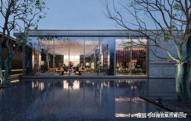 院落之内,围绕着中心“湖面”,组织了三栋建筑,纯净的水岸玻璃展厅,以及两栋住宅样板间。