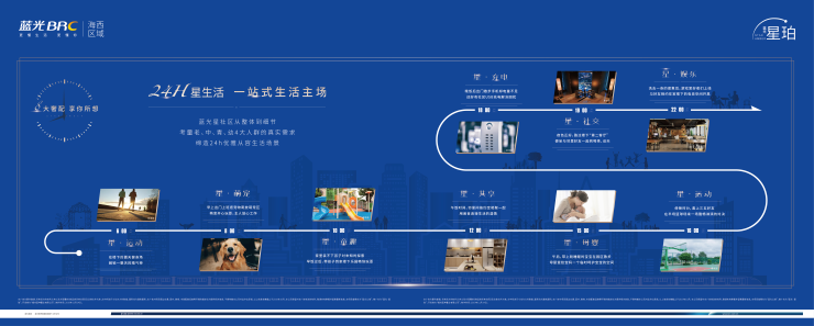<项目自身配套>社区内贴心定制星·运动、行·社交、星·视界、星·共享、星·娱乐、星·童趣、星·母婴、星·萌宠8大星生活空间,满足城市菁英阶层对生活的不同需求。
