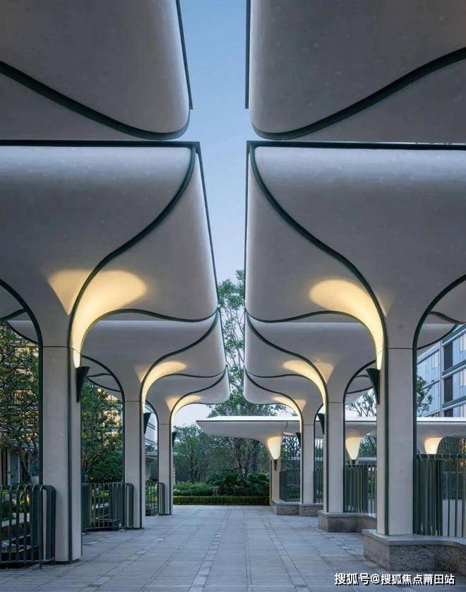 走进大门,你会看到大堂里的立柱,依然延续了玉树造型。当在街边看到那些优美的玉树造型,你就知道,这是绿城·芝澜月华。楼盘大门会用N重对称的玉树造型,形成更温柔的仪式感。玉树造型形成的「灰空间」,又能让你上车或下车的时候可以避免日晒雨淋。