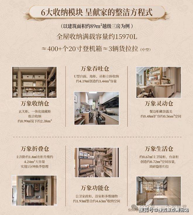 首创万象收纳系统,玄关+独立储藏间、厨房、餐边、卧室、家政卫浴一体六大功能仓。收纳功能科学分区,找东西不用”翻箱倒柜”。