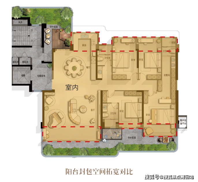 传统的四代宅仅通过扩大露台绿化来增加面积,实际居住体验一般。