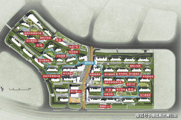 【全时段运动空间】楼下健身房、约7000㎡运动场、长约1400m跑道、篮球场。