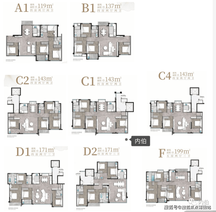 2、公摊差不多在20%,119㎡-137㎡得房率约80.3%,143㎡得房率约79.1%-81.7%,172㎡得房率约80.4%-81.8%,199㎡得房率约83.4%。
