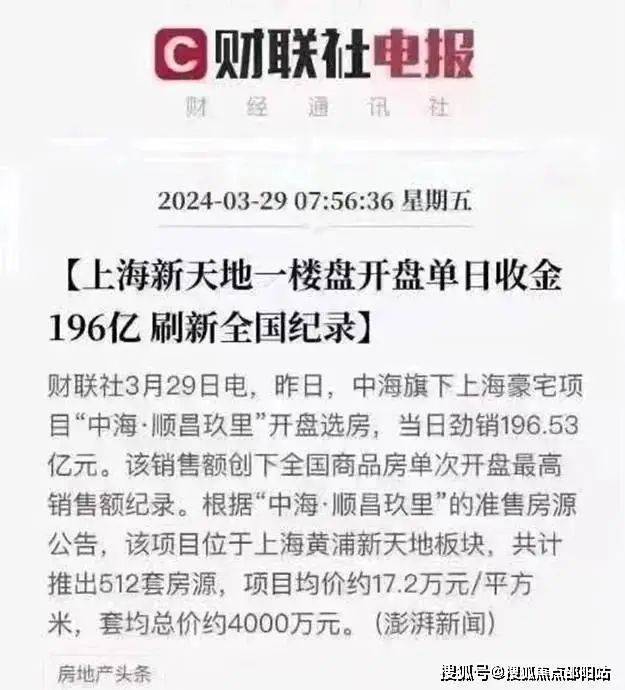 2024年3月28日,上海市中心原卢湾区中海顺昌玖里开盘,单日销售金额突破196.5亿元,刷新中国历史记录。