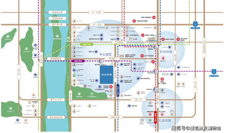 南郊公园、火车头公园、望江公园环伺,湘江风光带直线距离仅约800米,尽享自然风光;市中心医院、湖南中医药大学第一附属医院等5大三甲医院环伺,为健康保驾护航。