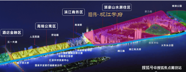 ②南湖新城,湘江东岸的璀璨明珠:长沙城发·南湖新城片区着力于打造“湘江东岸璀璨明珠”,总面积约5.02平方公里,是市委市政府“沿江建设、跨江发展”的重要片区,也是长沙市主城区的核心地带。集聚金融企业总部国家开发银行湖南省分行、湖南银行、长沙平安财富中心;汇聚高端商业汇景发展环球中心、长沙五矿广场、和立东升国际城市客厅;聚集了品质住宅保利国际广场、绿城凤起麓鸣、中海阅湘台等一线临江物业。
