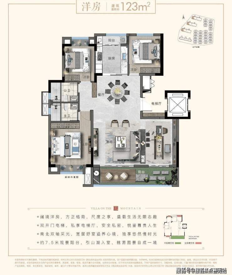步入客厅,约11.85m南向大开间迎阳光清风入室,将四时院落尽收眼底。南向双亲房的设计亦独具匠心,与晚辈分层而居,互不影响又方便出入。