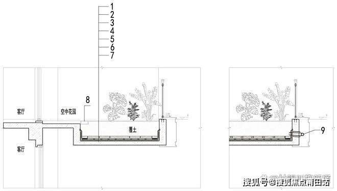空中花园构建了一种下沉式绿化系统,通过对阳台板结构的转换折板处理,解决种植土壤的流失问题,同时也隐藏了管道转换引起的露明问题,通过侧向转换排水支管,外侧利用装饰线条隐藏横向排水支管,有效解决管道露明的美观问题。