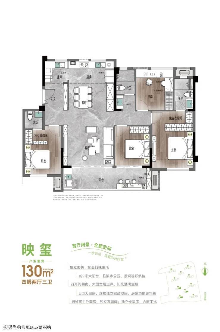 约110㎡的大四房户型,则采用了内外双玄关空间设计,配备6.8米超大宽幕阳台和落地玻璃窗,确保室内采光充足,视野通透。而约130㎡的四房户型,则特别考虑了高阶客群的居住私密感,采用了双主卧套房设计,得房率高达94%,并配置了独立家政空间,让居家功能更加完善。