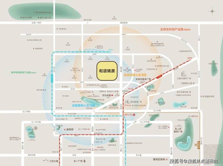 和颂锦原地处福州鼓楼之上的五四北核心生活圈,占据城市发展的战略要地。项目不仅近享鼓楼和五四北的成熟配套,更坐拥便捷的交通网络。家门口的地铁1号线和规划中的3号线交汇,四站即可直达鼓楼中心,东街口、五一广场、东百等城市核心商圈触手可及,满足了居民日常购物、娱乐、休闲的多元化需求。此外,项目周边还拥有丰富的商业配套,东端的五四北泰禾广场、沃尔玛、i33城市广场、闽台AD创意园,以及南端的金科嘉迪广场、华为总部、稻田创业小镇等,共同构成了一个繁华的商业生态圈,为居民提供了便捷的生活体验和良好的就业机会。