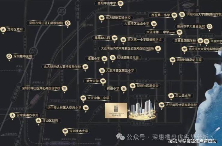 项目所处的位置在大亚湾西区,距离深圳坪山仅约4公里,南面背靠笔架山,寓意有靠山,东面一路之隔为12年制的广外附校,23年中考上线率达96%。区域內进驻的500强企业管理层及政府官员的小孩基本都选择了广外就读。
