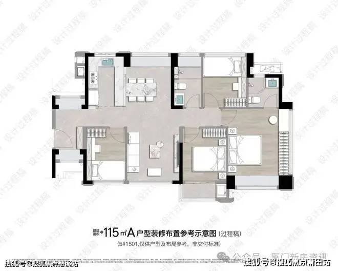 105㎡户型亮点十足,集美新城面积段最小的正南北通透四房,做到五开间朝南的设计,客厅面宽达到了 4.9 米,满足喜欢大客厅的客户群体,又满足了房间数的功能性,应该会成为爆款。