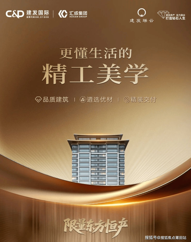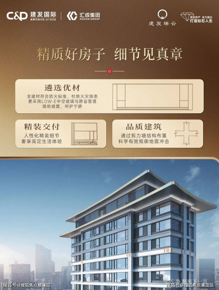 建筑设计:延续建发房产标志性中式门头,高约 8 米,宽约 44 米,搭配罗汉松、华文铜狮,尽显奢华与礼序。外立面采用 “钻石级” 高颜值设计,双重飞檐搭配简明金属流线,呼应城市天际线,选用伊朗进口蓝眼睛石材,外观高雅,历久弥新,最高窗地比可达约 44%。