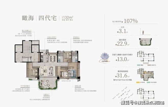 【132㎡墅级四代宅】:堪称片区产品力标杆,综合使用率高达107%,空间体验可媲美传统180㎡大平层产品。约15.9米南向面宽、四开间朝南布局,保证充足采光;约3.1米层高,搭配约29.8㎡入户及南向空中花园露台,创造垂直绿化体系;LDKG一体化设计,构建62.6㎡无界社交会客厅,打破传统空间界限。主卧采用双面观景酒店式设计,配备独立衣帽间、休息区和星级卫浴空间,打造度假式居住体验。