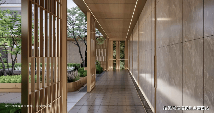 参鉴全球酒店“迪拜阿玛尼”微度假生活方式的设计理念;酒店式落客,约50米超长奢阔入口形象,以奢石与金属格栅彰显贵气,打造具有高级定制感的酒店式归家入口社区大门。约100米定制级艺术连廊,实现全区风雨无忧归家,尊享雅致归家礼仪。