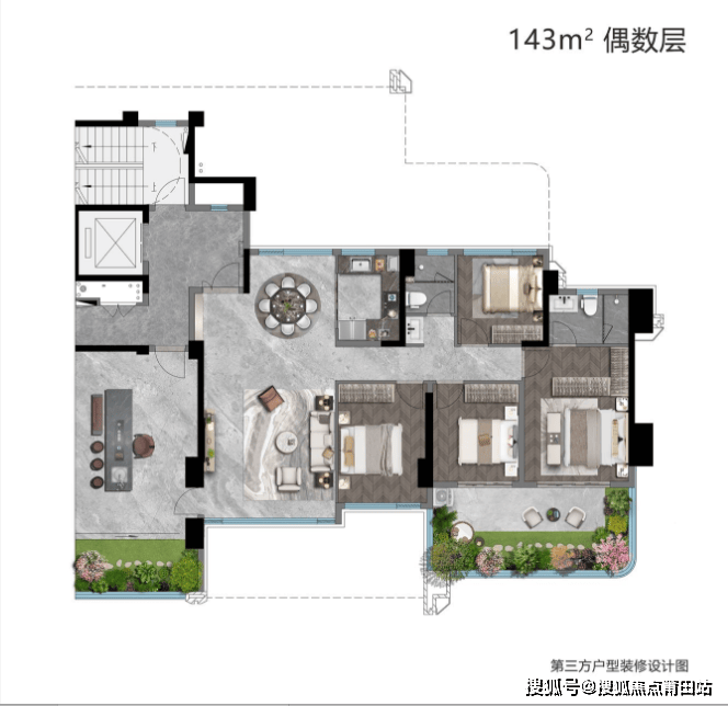 约6.3米挑高 南向空中双庭院;主卧连接270度转角花园,推窗即是一方优雅天地