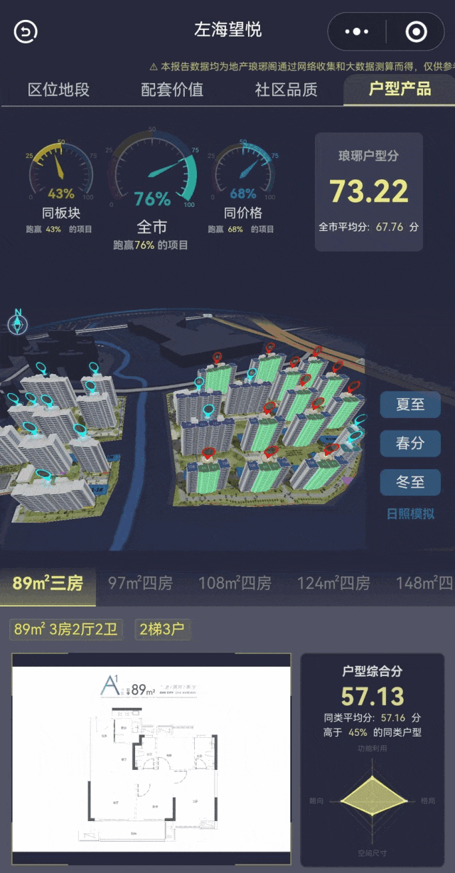 项目定位刚需首改,主要是小高层和洋房,户型整体设计中规中矩;其中89平三房为两梯四户的中间户,三开间,带双开间阳台,通过采光井实现通透;97平四房为洋房产品南北通透,三开间朝南;108平四房为两梯四户的端户,三开间朝南;124-148㎡独体独户,四开间朝南,双面宽阳台,舒适性较好,但148平有个客卫为暗卫。