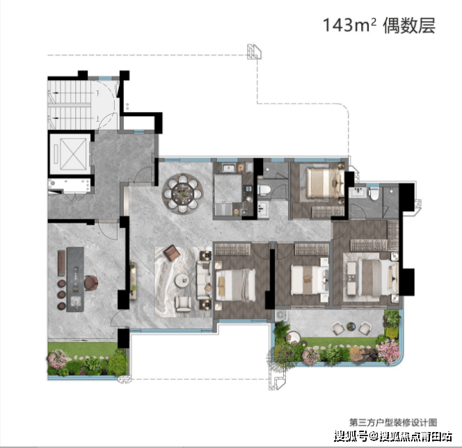 约6.3米挑高 南向空中双庭院;主卧连接270度转角花园,推窗即是一方优雅天地