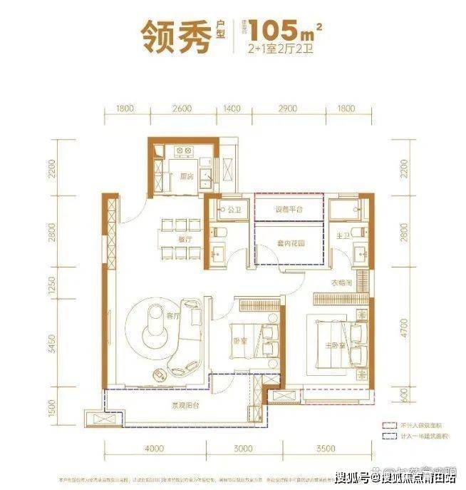 建面约105㎡户型:经典2+1室,户内少承重墙,可根据需求灵活布局,主卧南北通透大套房。