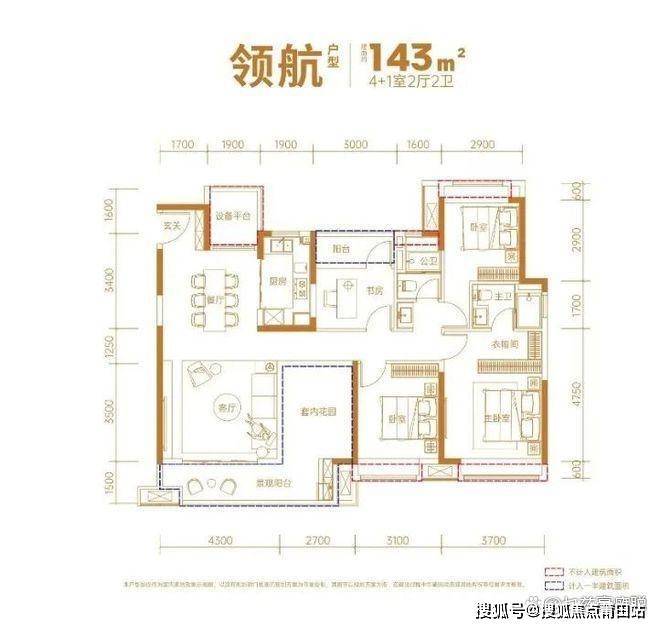 建面约143㎡户型:阔绰4+1室,约13.8米南向大面宽,南北双阳台布局,多处赠送空间。