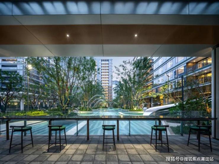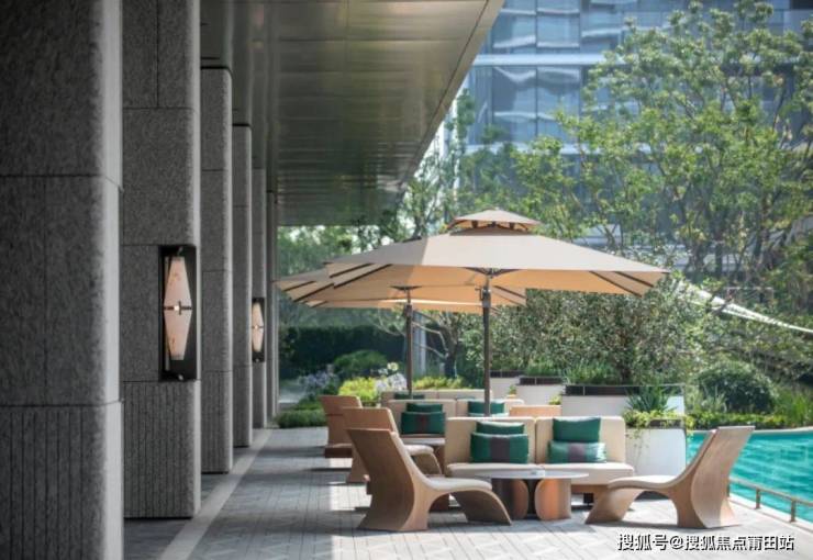 ▲嬉水池旁的「灰空间」和户外沙发,绿城·芝澜月华,杭州,实景图