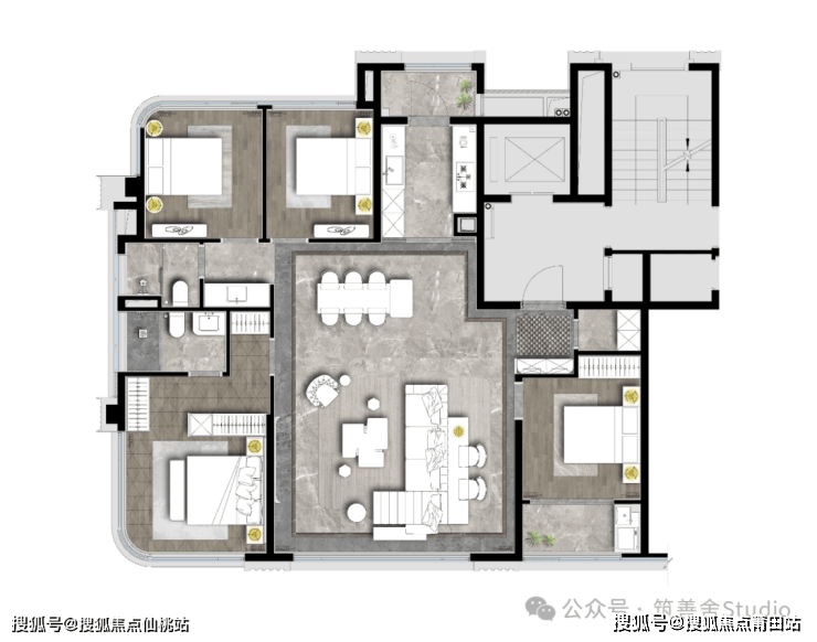 建筑面积约176平方米的户型在155基础上升级了一个卫生间,多一个套房。