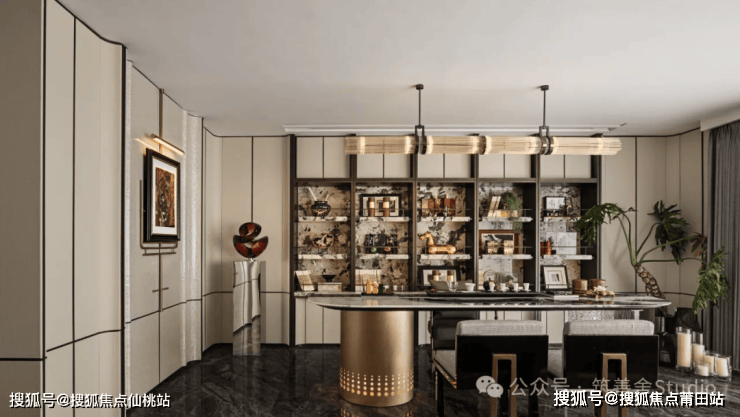 餐厅空间以鲜明色彩点亮,吧台与大理石材质的广泛运用,赋予其独特的奢华气质。在这里,四季流转,于吧台式操作台旁,一边欣赏厨师烹饪的艺术,一边品味全球美食,享受每一刻的盛宴时光。餐厅巧妙采用熔岩流淌与冰川消融的自然景观为设计灵感,匠心独运地打造出剔透如镜、形态各异的不规则球形灯饰,生动展现出岩石溶解的奇妙美感。精选花艺与墙面艺术画作交相辉映,为餐厅空间注入了源源不断的艺术魅力。在日常饮食间,每一件家具都透露着非凡的艺术格调,为生活增添了一抹雅致的光彩。