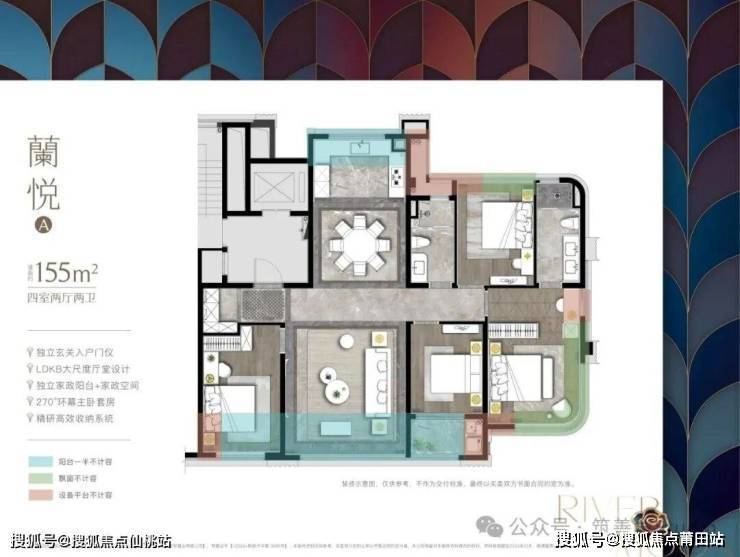 看户型,外墙一圈基本上都是阳台、飘窗、设备平台,155平做出实际180平的效果。