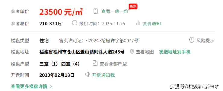 左海望悦的参考均价为23,500-25,000元/平方米,单套总价约200-410万元。这一价格相对于福州仓山核心区(如金山、奥体)3万+的单价,具有一定的价格优势。