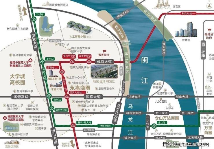 紧邻候官大道,傲踞洪塘大桥桥头堡、脉连三环、福州绕城高速,地铁2号线轨交覆盖,多为立体路网纵横交通。