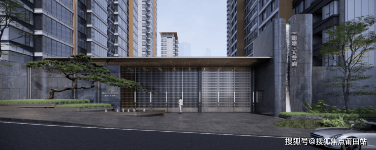 隐奢典藏大门,奢石景墙,造型有“开卷望府”寓意。入门处的水景及造型叠水,寓意聚水引财。