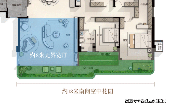 强调庭院与室内空间的互通,南向连接的约18米空中花园,