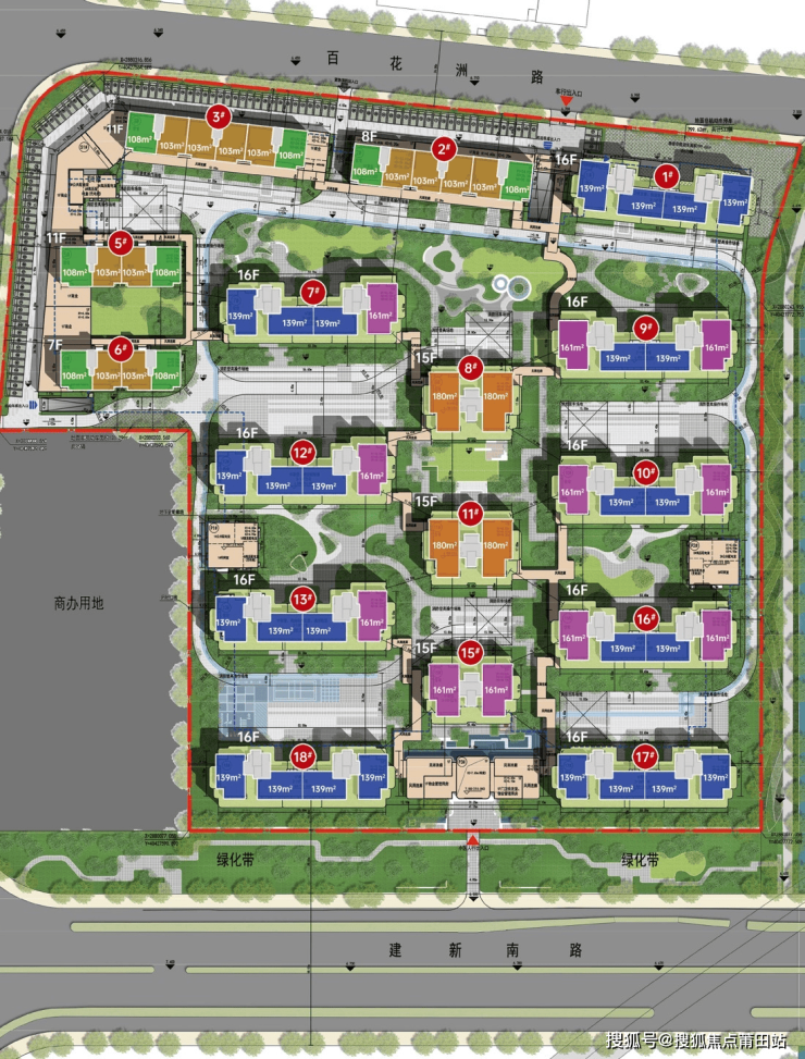 项目主打103㎡三房到180㎡四房户型,整体定位改善客群: