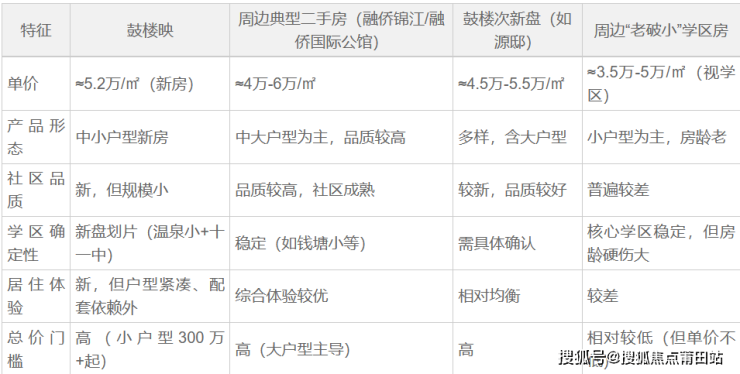 3. vs “老破小”学区房: 鼓楼映提供了稀缺的“新房+学区”组合,环境与产品代际优势碾压老房。但老破小凭借更低总价(尤其小面积)和长期稳定的学区记录,仍是预算有限者的务实选择。鼓楼映的高单价是主要壁垒。