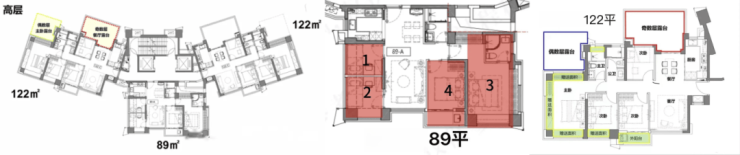 A2地块的建发·阅海,分2栋高层和7栋洋房,高层89-122平,洋房106—124平,洋房户型和120平以上的高层户型都引入了四代宅的概念,整体综合使用率为87%-108%。