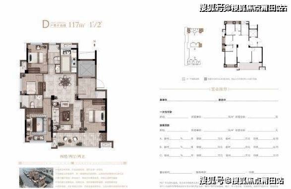 户型鉴赏117㎡1.四房两厅两卫,专属独立电梯,多一域使用空间,尽享归家礼仪2.餐客厅阳台一体化,敞阔空间尊贵彰显,待客之道更为雍容3.南向超大观景阳台,坐拥惬意生活4.双卧朝南,主卧享独立卫浴,次卧连观景阳台,享休憩时光