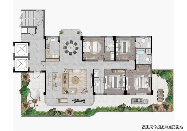"1. 音西首个高奢第四代立体住宅,打破传统固有住宅仅有的阳台,融入了奢阔露台,实现“层层有庭院,户户有花园”的美好生活愿景。