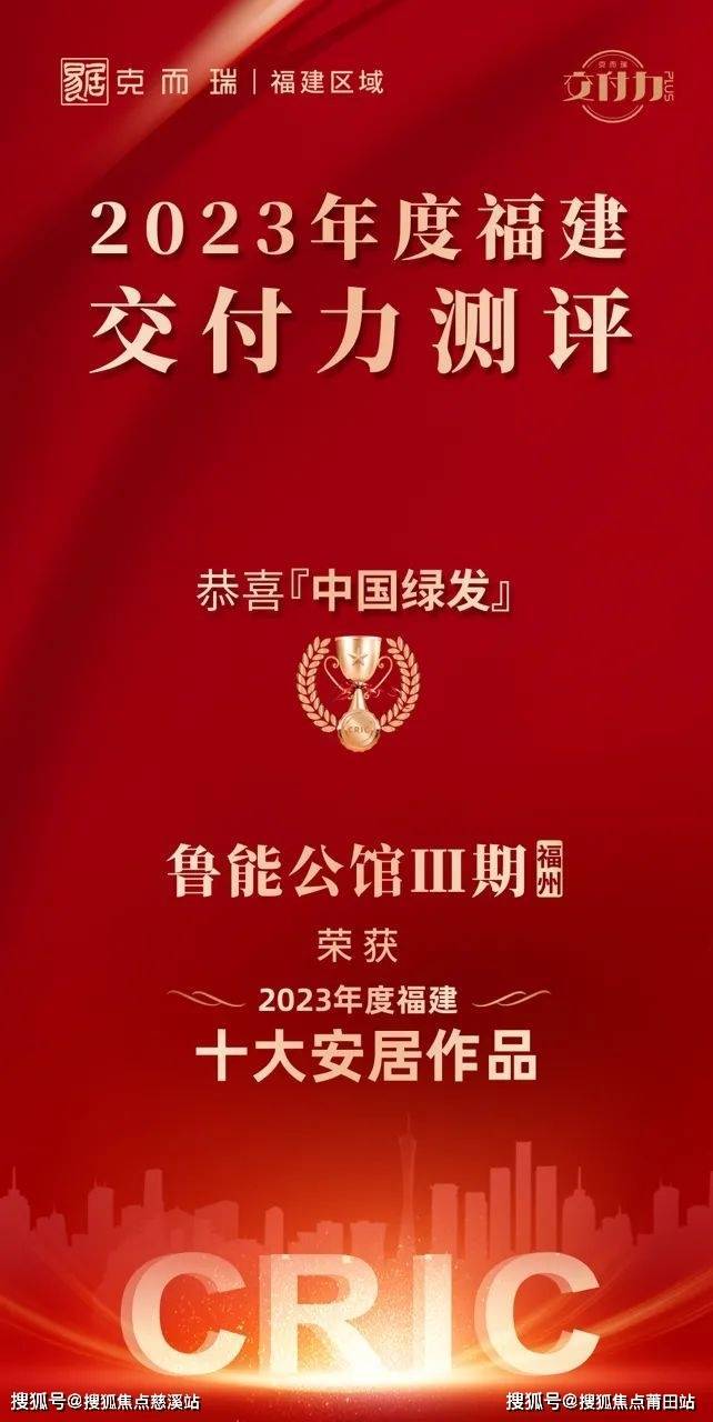 围绕项目总体交付指标、室内空间、公共区域、建筑立面、园林景观、社区设施、服务体系等维度进行全面测评并评定,鲁能公馆Ⅲ期荣获“克而瑞2023年度福建十大安居作品”。
