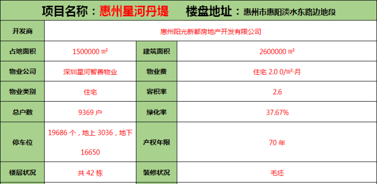 惠州星河丹堤位于惠阳区亚公顶森林公园旁,紧邻厦深高铁惠州南站。由星河集团打造,是惠湾片区占地超百万平的标志性大盘。项目于2011年入市,整体分6大期开发,预计开发周期为8-10年左右,产品类型主要由洋房、高层及别墅产品组成。此外,星河集团与惠阳区人民政府联合引进了公办学校华南师范大学附属惠阳学校已于2014年开学。