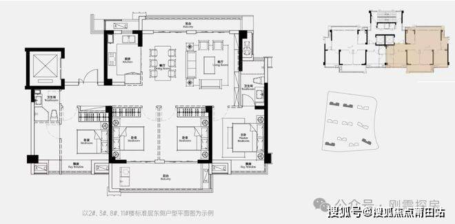 170平:四房两厅三卫,一梯一户,150平观景产品的升级,最大特色就是双主卧设计,特别是右侧主卧搭配书房,功能性拉满,要说不足,还是一个暗卫,还是无法南北通透,虽然是横厅设计,不过在这个面积段,公区的面积还是稍显一般。