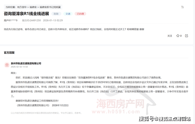 2026年2月2日,泉州市轨道交通集团在回复网友相关咨询时透露,R1线(泉州段)项目环境影响评价于2025年9月已取得批复,目前项目全线初步设计文件已通过专家评审,正在加快推进施工图设计及相关手续报批工作。