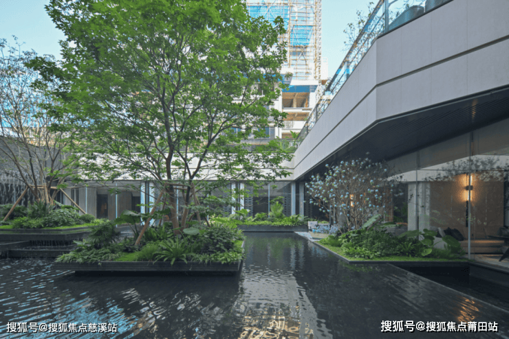 下沉平台采用圣诞米黄大理石花池,搭配带有南方热带种植氛围的植物,提供独特的休憩空间,让居者能在此处感受绿意与水声交织的美好。