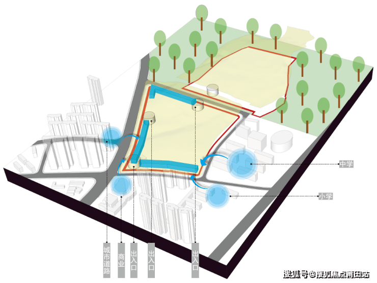 借助周边教育、商业交通节点,连接城市界面,落位主要出入口与社区商业。